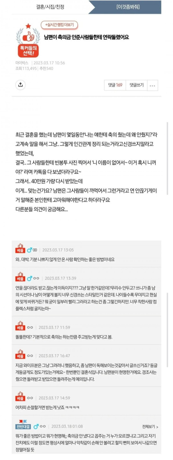 남편이 축의금 안준 사람들한테 연락 돌렸어요4 > 유머/감동
