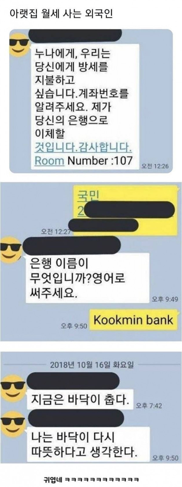 아랫집 월세사는 외국인이 보낸 문자 페이지 정보 작성자 clever 댓글 0건 조회 3,427회 작성일 24-04-03 17:39 목록 답변 글쓰기 게시판 리스트 옵션 수정 삭제 본문 . 쿠팡 파트너스 활동의 일환으로, 이에 따른 일정액의 수수료를 제공받습니다. 이전글카드를 분실했는데 300원이 긁혔네요 24.04.03 다음글새마을 금고 폭탄 테러 협박범의 정체 24.04.03 댓글 0 댓글목록 등록된 댓글이 없습니다.