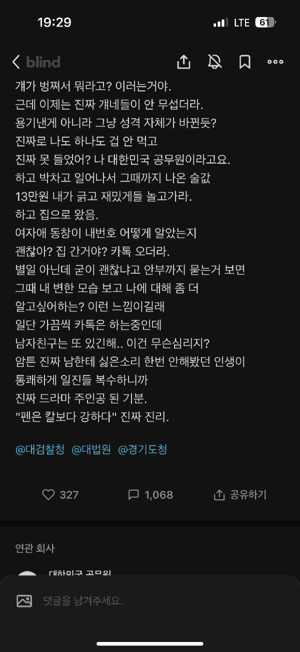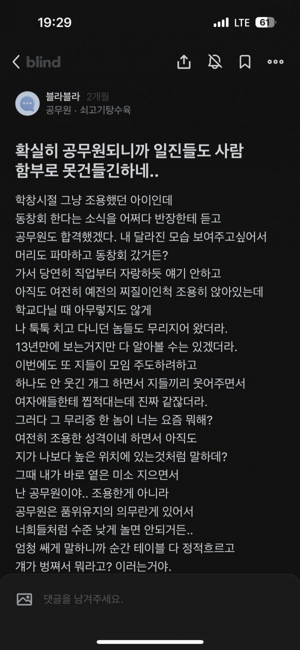 오늘자 싱글벙글 블라인드 공무원 > 유머/감동