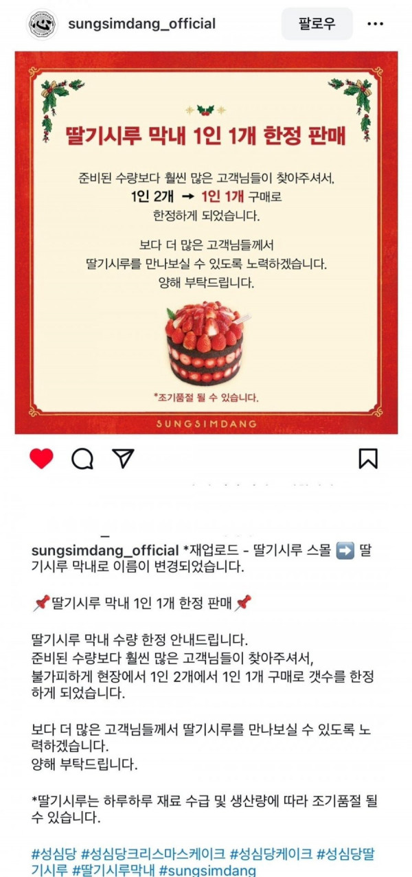 성심당 딸기시루 스물 -> 딸기시루 막내 로 이름변경