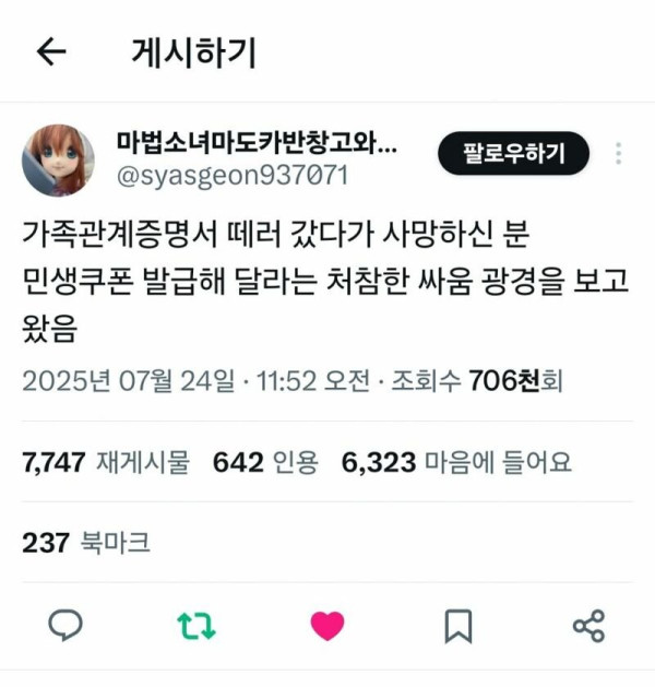 요즘 주민센터 민생지원금 민원 근황31 페이지 정보 작성자 횬이짱 댓글 0건 조회 1,444회 작성일 25-10-08 19:11 목록 답변 글쓰기 게시판 리스트 옵션 수정 삭제 본문 요즘 주민센터 민생지원금 민원 근황31 쿠팡 파트너스 활동의 일환으로, 이에 따른 일정액의 수수료를 제공받습니다. 이전글심심이에게 손박대전 물어봄.jpg1 25.10.08 다음글짱국보다 낫다9 25.10.08 댓글 0 댓글목록 등록된 댓글이 없습니다.