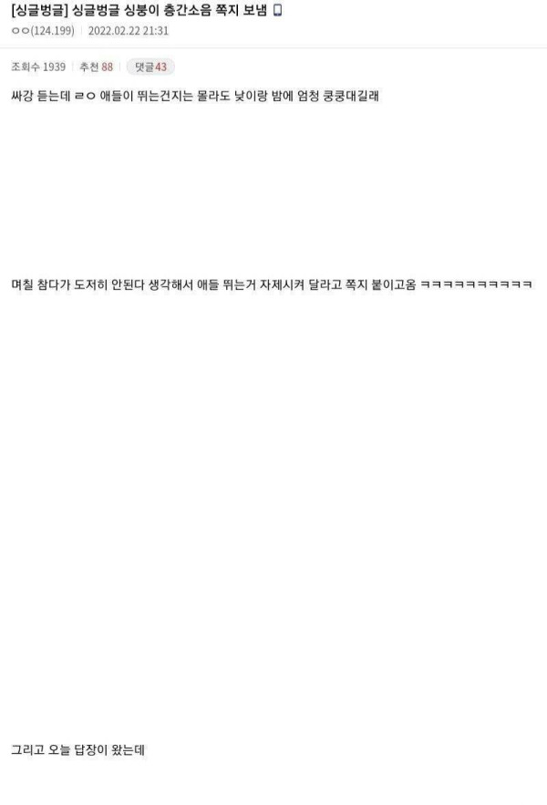 참다참다 층간소음 쪽지 보낸 디시인1 > 유머/감동