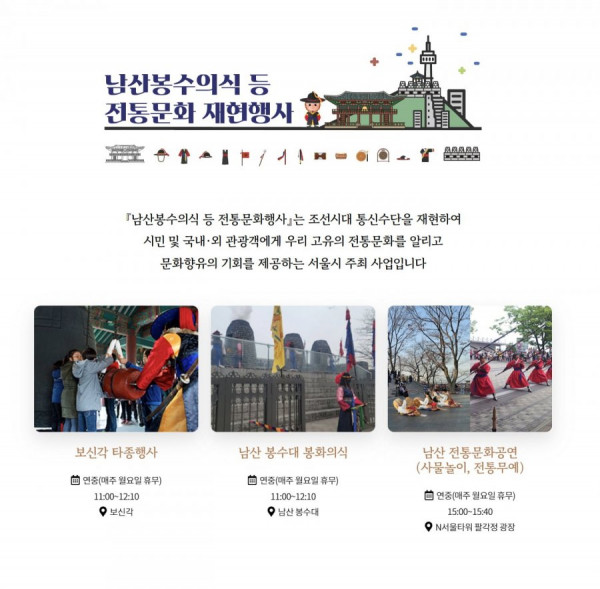 보신각, 남산봉수대, 남산타워 앞 전통문화 행사 (무료)